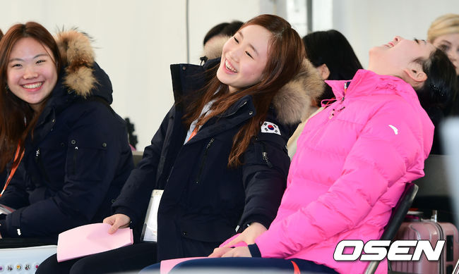 12일 오전 서울 목동아이스링크에서 진행된 '2015 사대륙 피겨선수권 대회' 여자 피겨 싱글 조추첨에서 박소연과 김해진, 리지준이 미소 짓고 있다