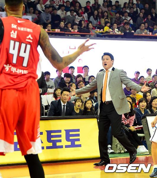 2쿼터, SK 문경은 감독이 파울 판정에 어필하고 있다.
