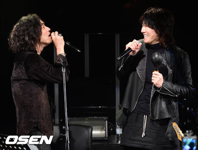 25일 오후 서울 종로구 홍익아트센터 소극장에서 진행된 가수 김장훈과 배우 최민수의 콜라보 공연에서, 김장훈과 최민수가 함께 열창을 하고 있다.