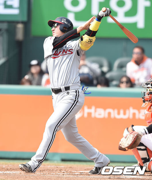 8일 오후 대전 한밭구장에서 열린 ‘2015 타이어뱅크 KBO 리그’ 시범경기 한화 이글스와 LG 트윈스의 경기, 1회초 1사 LG 정성훈이 선취 솔로홈런을 날리고 있다.