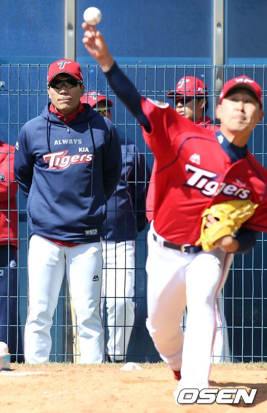 윤석민 불펜 피칭 바라보는 KIA 이대진 코치
