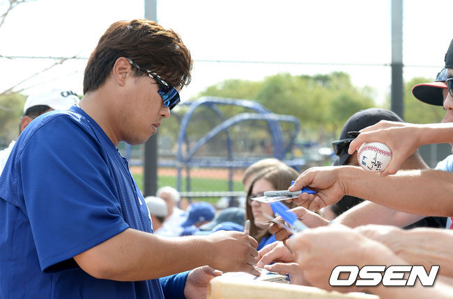 훈련을 마친 류현진이 팬들에게 사인을 해주고 있다.
