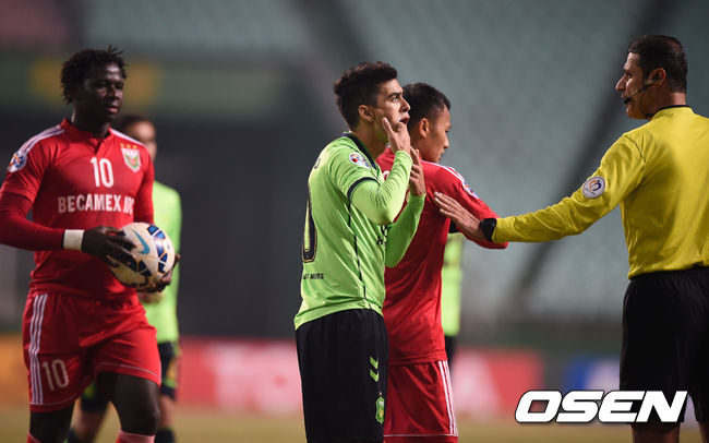 전반 전북 레오나르도가 빈즈엉 수비에 걸려 넘어지며 주심에 불만을 나타내고 있다.
