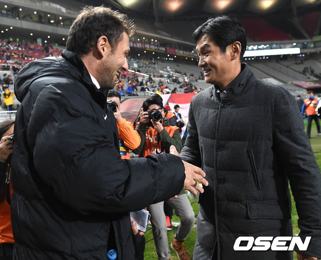 18일 오후 서울월드컵경기장에서 열린 2015 아시아축구연맹(AFC) 챔피언스리그 조별리그 H조 3차전 FC서울과 웨스턴 시드니의 경기 시작전 최용수 감독과 토니 포포비치 감독이 인사를 나누고 있다.