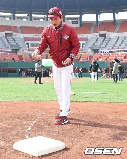 넥센 염경엽 감독이 2루 베이스에 술을 뿌리며 우승을 기원하고 있다.