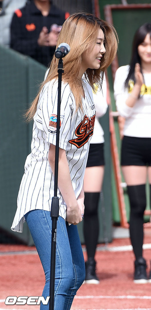 28일 오후 부산 사직구장서 열린 '2015 타이어뱅크 KBO 리그' 개막전에 앞서 헬로비너스 서영이 애국가를 부르고 있다