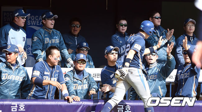 4회초 2사 2루 NC 박민우가 이종욱의 적시타로 득점을 올린 뒤 기뻐하고 있다.