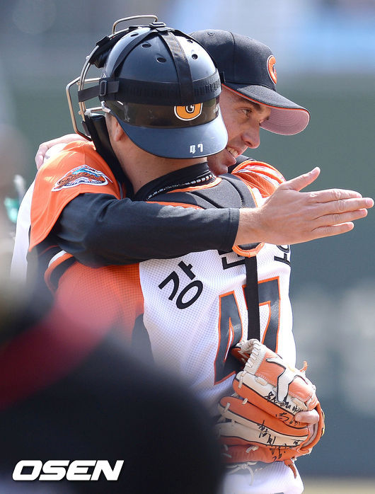 29일 오후 부산 사직구장서 열린 '2015 타이어뱅크 KBO 리그' 롯데 자이언츠와 kt위즈의 경기에 앞서 시구를 마친 사도스키 스카우트 코치와 강민호가 포옹을 하고 있다.
