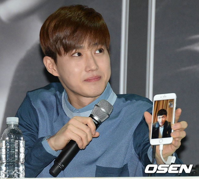 엑소 수호가 30일 오전 서울 삼성동 코엑스 SM타운에서 열린 컴백 기자회견에서 레이와 화상통화를 하고 있다.