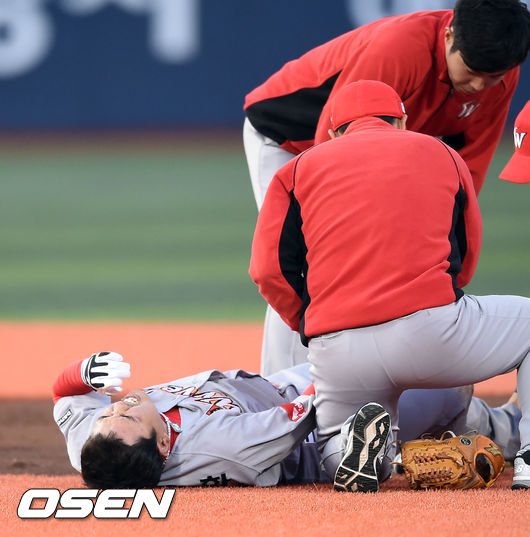 3일 오후 서울 목동구장에서 열린 '2015 타이어뱅크 KBO리그' 넥센 히어로즈와 SK 와이번스의 경기,1회말 넥센 서건창의 내야땅볼 타구 수비 도중 부상을 당한 SK 나주환이 고통스러워하고 있다.