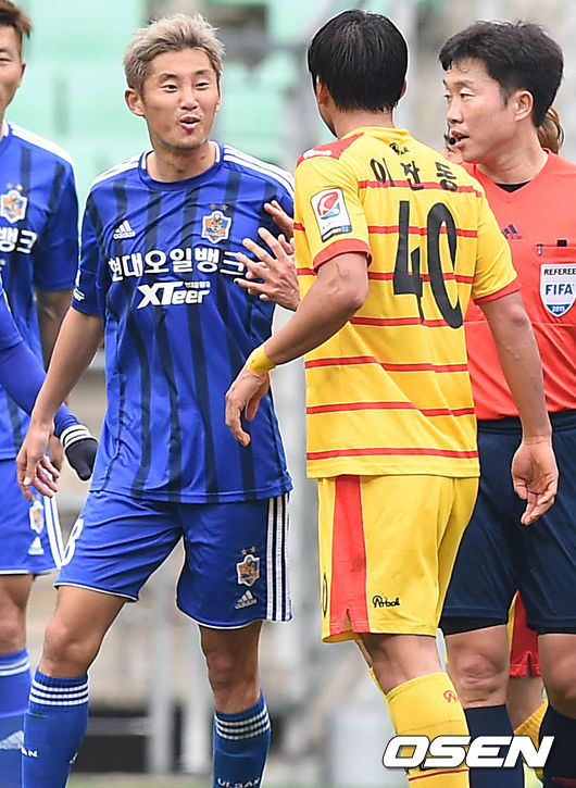 후반 울산 하성민과 광주 이찬동이 파울 이웋 신경전을 벌이고 있다.