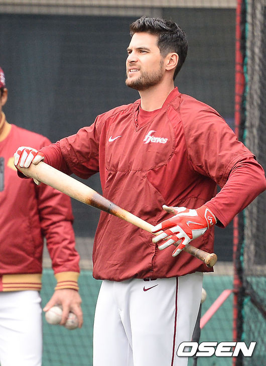 경기에 앞서 넥센 스나이더가 타격 훈련을 바라보고 있다.