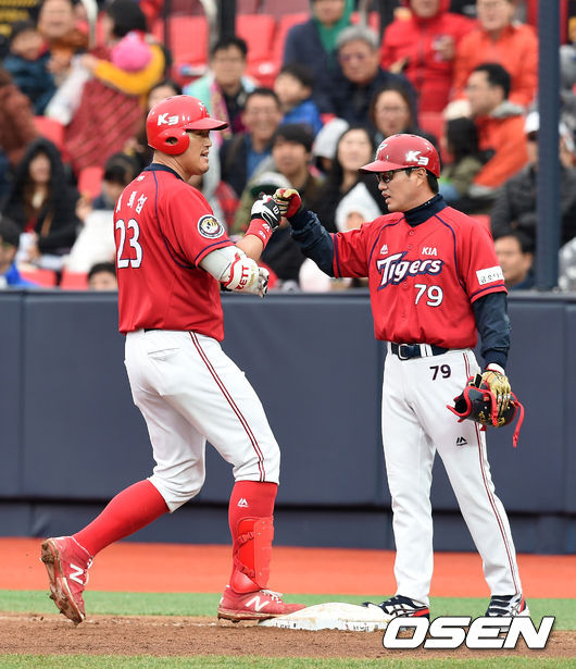 7회초 1사 1,3루에서 KIA 최희섭이 중전 적시타를 치고 김태룡 코치와 하이파이브를 하고 있다.