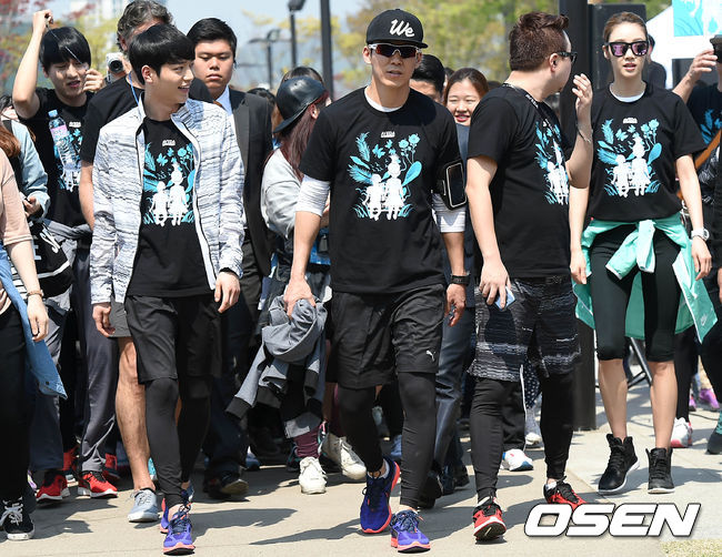 24일 오전 서울 중구 남산 백범광장에서 열린 아베다(AVEDA)의 2015년 물을 위한 걷기대회에서 배우 서강준, 가수 션, 개그맨 박휘순, 배우 최여진이 행사에 참여하고 있다.