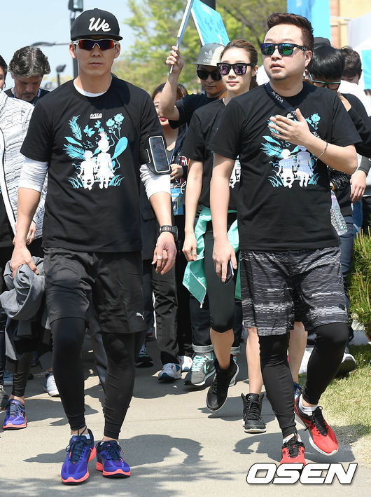 24일 오전 서울 중구 남산 백범광장에서 열린 아베다(AVEDA)의 2015년 물을 위한 걷기대회에서 가수 션, 개그맨 박휘순, 배우 최여진이 행사에 참여하고 있다.