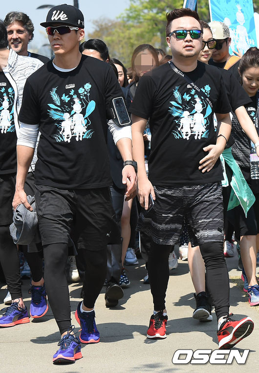 24일 오전 서울 중구 남산 백범광장에서 열린 아베다(AVEDA)의 2015년 물을 위한 걷기대회에서 가수 션과 개그맨 박휘순이 행사에 참여하고 있다.