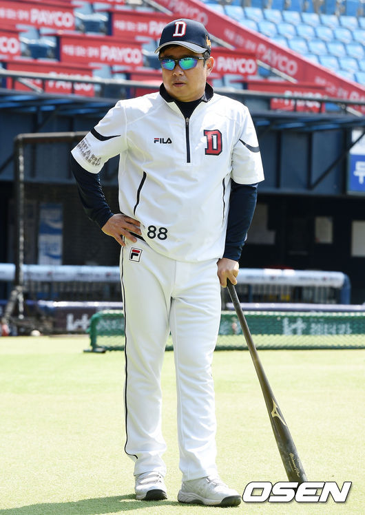 26일 오후 서울 잠실야구장에서 열린 '2015 타이어뱅크 KBO리그' 두산 베어스와 KIA 타이거즈의 경기, 경기에 앞서 두산 김태형 감독이 훈련을 지켜보고 있다.