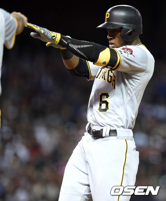 9회초 피츠버그 공격 2사 2루 상황 스탈링 마르테가 역전 1타점 좌전안타를 날리고 1루에 안착해 환호하고 있다.