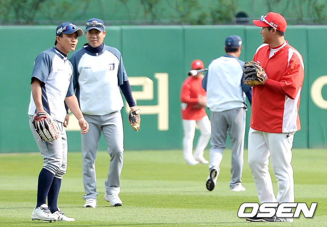 28일 오후 인천SK행복드림구장에서 열리는 '2015 타이어뱅크 KBO 리그' SK 와이번스와 NC 다이노스의 경기 시작전 이종욱이 몸을 풀기위해 외야로 나가는 중 수비 훈련을 하던 최정과 이야기를 나누고 있다.