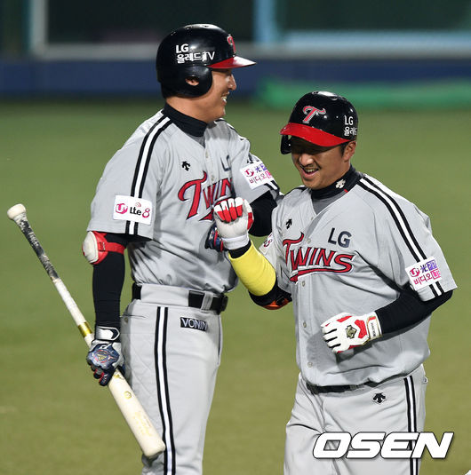 4회초 무사 1루에서 LG 이병규가 좌중월 투런 홈런을 치고 홈에서 이진영과 하이파이브를 하고 있다.