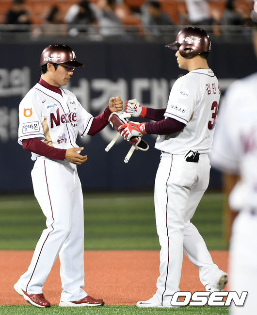 28일 오후 서울 목동야구장에서 열린 '2015 타이어뱅크 KBO 리그' 넥센 히어로즈와 롯데 자이언츠의 경기, 7회말 2사 주자 2,3루 넥센 김민성이 2타점 적시 2루타를 치고 코치와 기쁨을 나누고 있다.