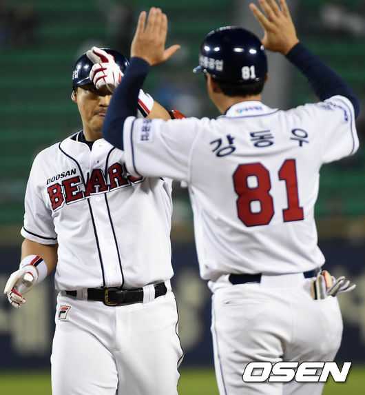 30일 오후 서울 잠실야구장에서 열린 '2015 타이어뱅크 KBO 리그' 두산 베어스와 kt 위즈의 경기, 6회말 1사 주자 2루 두산 홍성흔이 동점 적시타를 치고 1루에서 강동우 코치와 기쁨을 나누고 있다.