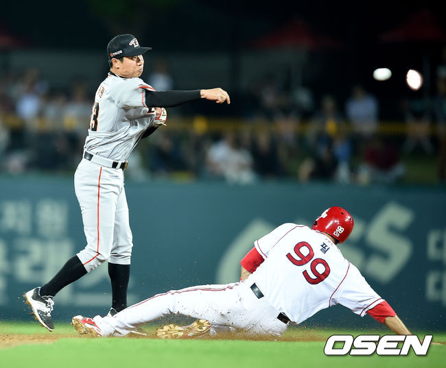 6회말 1사 1루에서 한화 권용관이 KIA 최희섭의 2루 땅볼에 필을 포스아웃시키고 1루로 송구하고 있다.