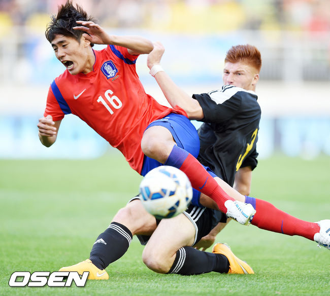 1일 오후 경기도 수원시 수원월드컵경기장에서 열린 '2015 수원 JS컵 U-18 국제청소년축구대회' 한국과 벨기에의 경기, 후반 한찬희가 벨기에 수비에 걸려 넘어지고 있다.