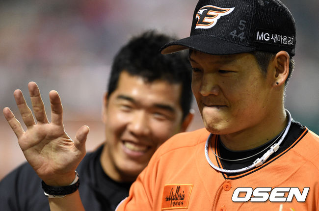 8회초 한화 박정진이 마운드를 내려가며 더그아웃에서 동료들과 하이파이브를 하고 있다.