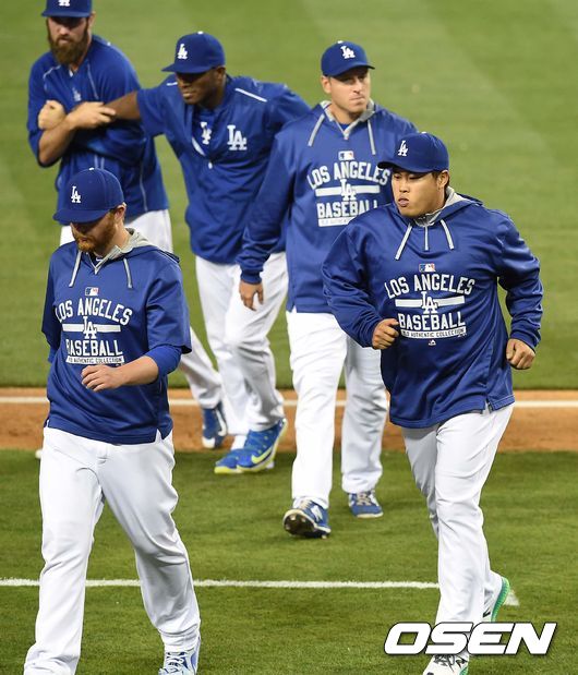 다저스 류현진을 비롯한 선수들이 하이파이브를 나눈 뒤 그라운드를 나서고 있다./dreamer@osen.co.kr