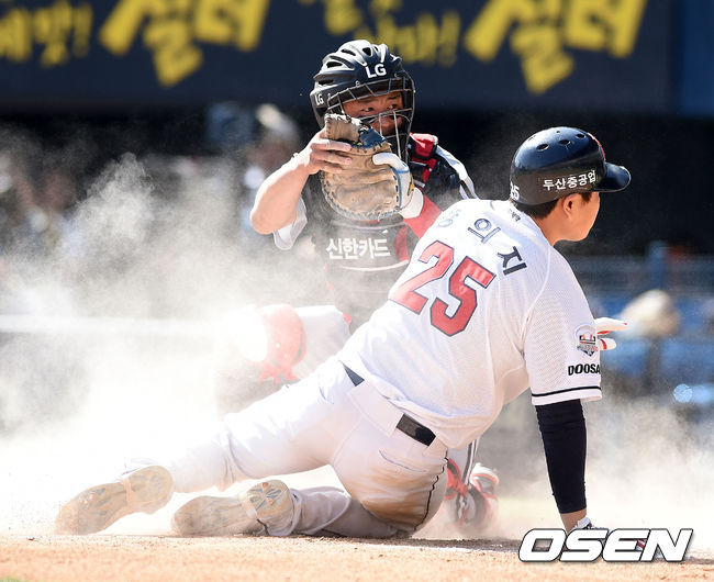 4회말 1사 만루에서 두산 양의지가 김재호의 희생플라이에 태그업, LG 최경철의 태그에 앞서 세이프되고 있다.