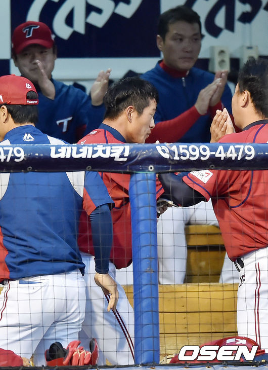 6일 오후 창원시 마산 야구장서 열린 '2015 타이어뱅크 KBO 리그' NC 다이노스와 KIA 타이거즈의 경기, 2회초 2사 주자 3루 KIA 강한울의 중견수 앞 1타점 적시타때 오늘 한화에서 트레이드 된 홍건희 유니폼을 입은 노수광이 홈을 밟은 후 덕아웃에서 동료들과 하이파이브를 하고 있다.