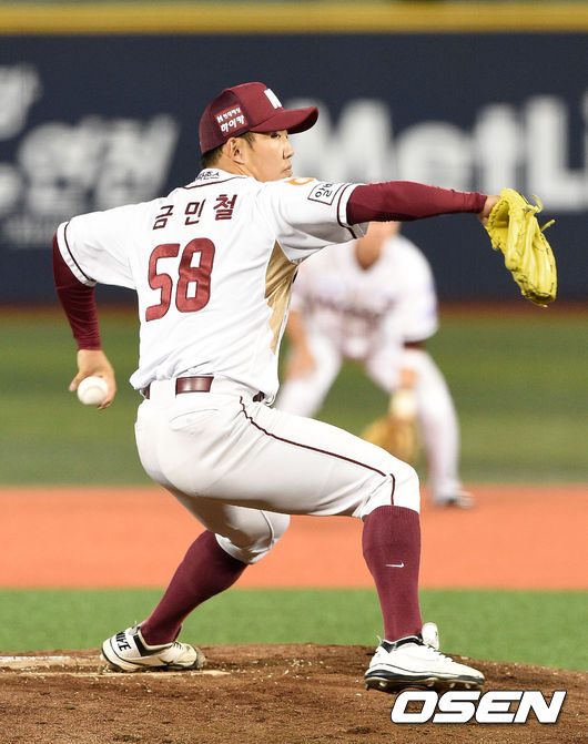 5회초 1사 1루에서 넥센 금민철이 힘차게 공을 던지고 있다.