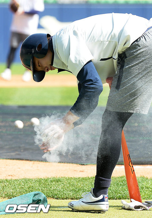 21일 오후 서울 잠실야구장에서 열린 '2015 타이어뱅크 KBO 프로야구' 두산 베어스와 삼성 라이온즈의 경기, 경기시작전 두산 민병헌이 훈련하고 있다.