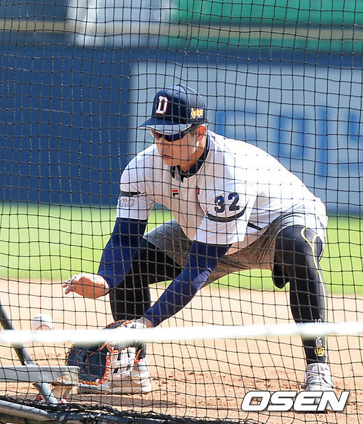21일 오후 서울 잠실야구장에서 열린 '2015 타이어뱅크 KBO 프로야구' 두산 베어스와 삼성 라이온즈의 경기, 경기시작전 두산 김재환이 훈련하고 있다.