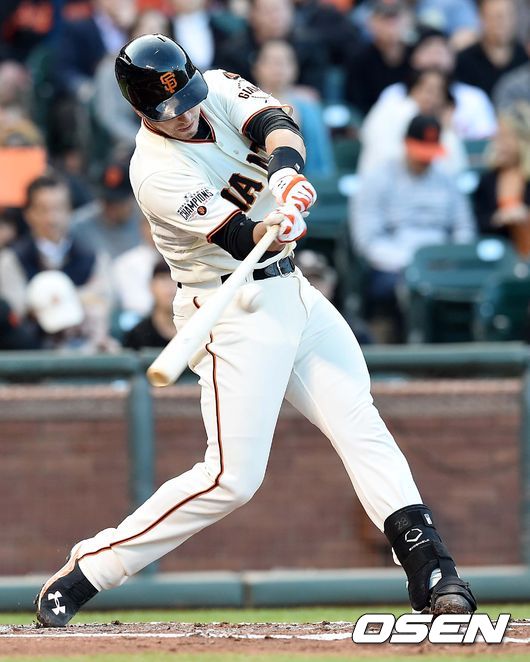 1회말 샌프란시스코 공격 1사 2, 3루 상황 버스터 포지가 선제 2타점 우익수 방면 2루타를 날리고 있다..