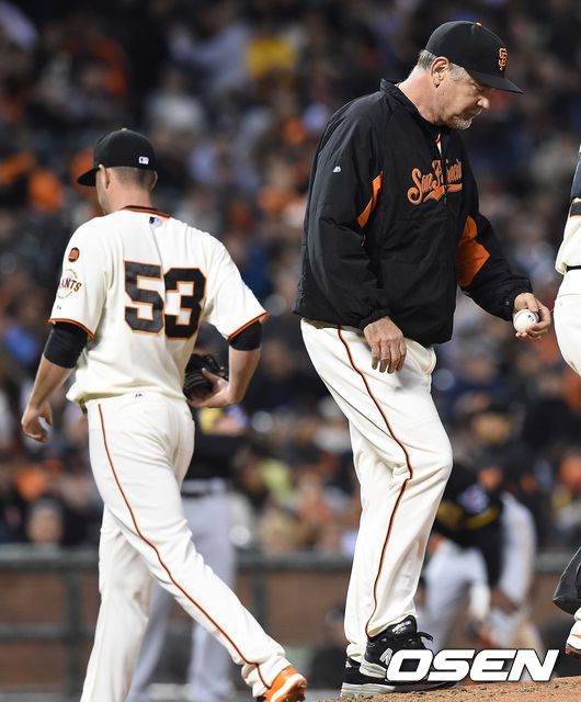 4회초 피츠버그 공격 2사 3루 상황 샌프란시스코 브루스 보치 감독이 선발 크리스 헤스턴을 교체하고 있다.