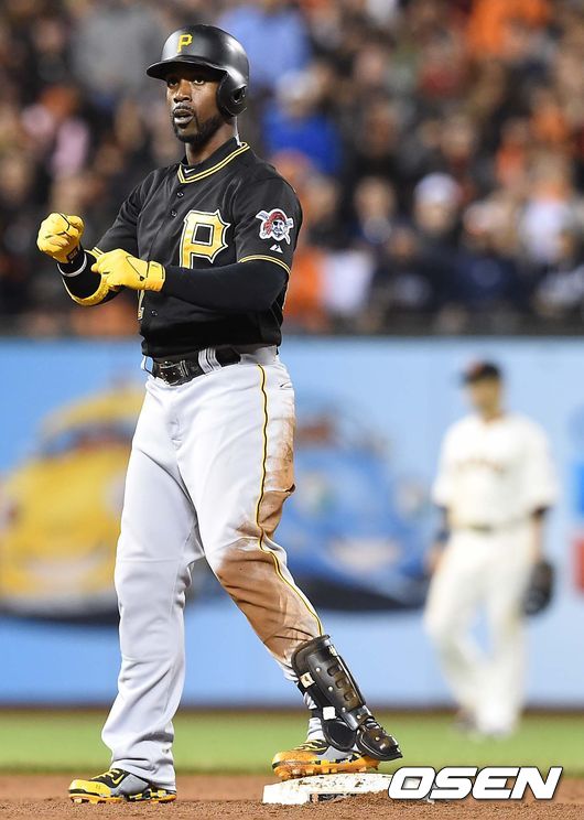 6회초 피츠버그 공격 1사 1루 상황 앤드류 맥커친이 적시 1타점 우익선상 2루타를 날리고 2루에 안착해 기뻐하고 있다.