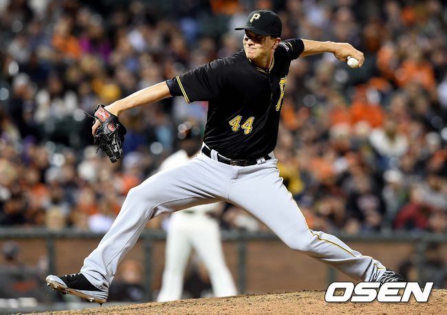 8회말 샌프란시스코 공격 때 마운드에 오른 피츠버그 투수 토니 왓슨이 힘차게 공을 뿌리고 있다.