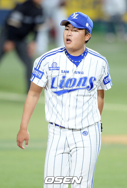 17일 오후 대구구장서 열린 ‘2015 타이어뱅크 KBO 리그’ 삼성 라이온즈와 두산 베어스의 경기,6회초 2사 2,3루 두산 김재호를 삼진아웃 잡은 삼성 심창민이 더그아웃으로 들어가고 있다.