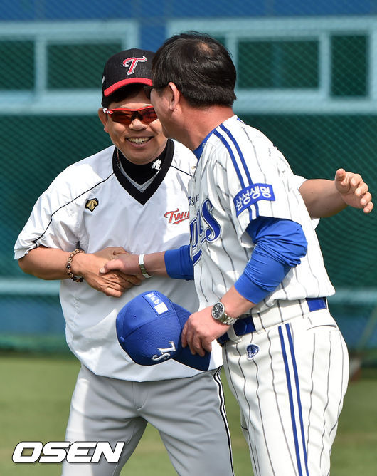 3일 오후 대구 대구시민운동장 야구장에서 열린 '2015 타이어뱅크 KBO 리그' 삼성 라이온즈와 LG 트윈스의 경기가 열릴 예정인 가운데, 양 팀 훈련 시간에 LG 양상문 감독과 삼성 류중일 감독이 악수와 포옹을 나누고 있다.