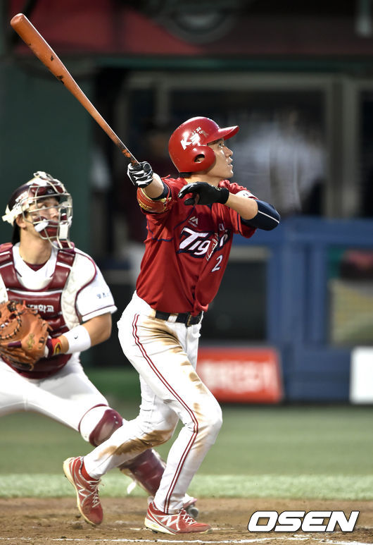 7일 목동구장에서 벌어진 넥센 히어로스와 KIA 타이거즈의 경기 5회초 무사 1루 신종길이 2루타를 치고 있다.