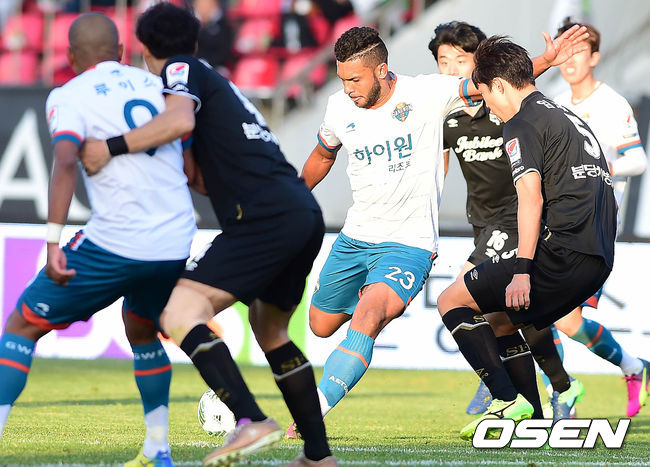 20일 오후 경기도 성남시 탄천종합운동장에서 열린 '현대오일뱅크 K리그 클래식 2016' 성남 FC와 강원 FC의 승강 플레이오프 경기 후반 마테우스가 슈팅을 하고 있다. / baik@osen.co.kr