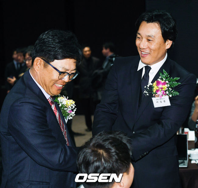 7일 오전 서울 소공동 플라자호텔에서 진행된 2016 조아제약 프로야구대상에서 이승엽이 LG 양상문 감독에게 인사를 하고 있다. / soul1014@osen.co.kr