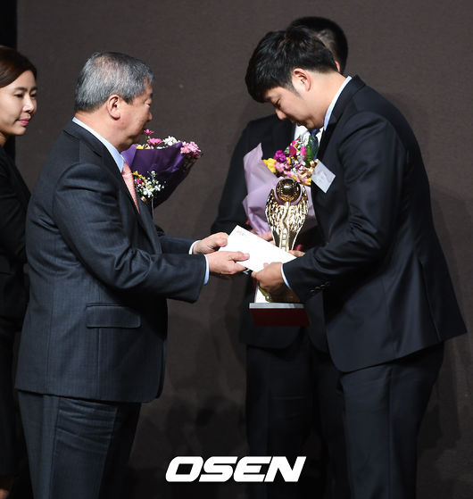 7일 오전 서울 소공동 플라자호텔에서 진행된 2016 조아제약 프로야구대상에서 두산 장원준이 최고투수상을 수상하고 있다. / soul1014@osen.co.kr