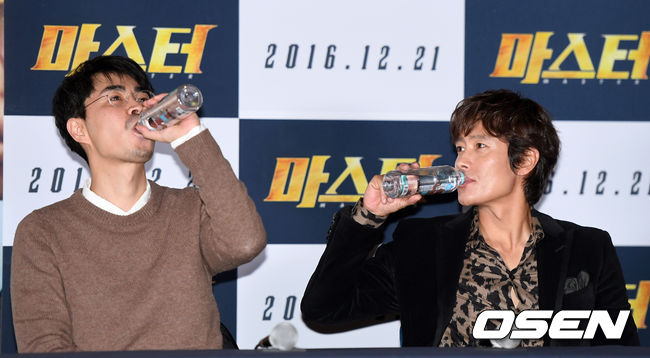 배우 이병헌과 조의석 감독이 12일 오후 서울 행당동 CGV왕십리에서 열린 영화 '마스터'(감독 조의석) 언론시사회에 참석해 취재진의 질문에 답한 뒤 물을 마시고 있다. /dreamer@osen.co.kr