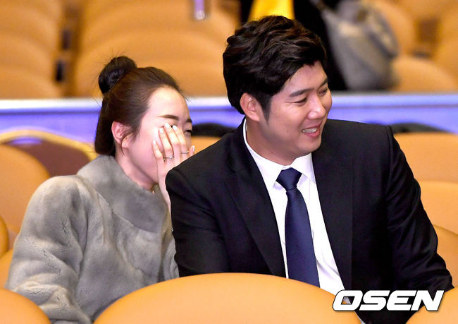 두산 장원준과 예비신부가 12일 오후 서울 삼성동 코엑스 오디토리움에서 열린 '2016 카스포인트 어워즈'에 참석해 미소짓고 있다. /dreamer@osen.co.kr