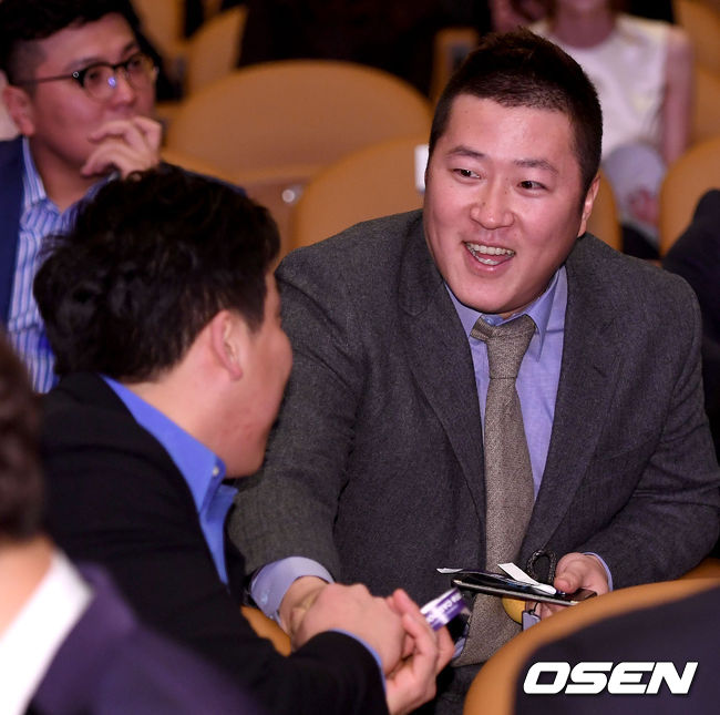 KIA 최형우와 메이저리거 김현수가 12일 오후 서울 삼성동 코엑스 오디토리움에서 열린 '2016 카스포인트 어워즈'에 참석해 인사를 나누고 있다. /dreamer@osen.co.kr