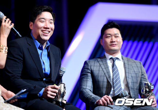메이저리거 김현수와 오승환이 12일 오후 서울 삼성동 코엑스 오디토리움에서 열린 '2016 카스포인트 어워즈'에 참석해 공로상을 수상한 뒤 소감을 전하며 미소짓고 있다. /dreamer@osen.co.kr