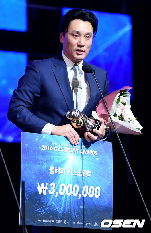 삼성 이승엽이 12일 오후 서울 삼성동 코엑스 오디토리움에서 열린 '2016 카스포인트 어워즈'에 참석해 올해의 카스모멘트를 수상한 뒤 소감을 전하고 있다. /dreamer@osen.co.kr